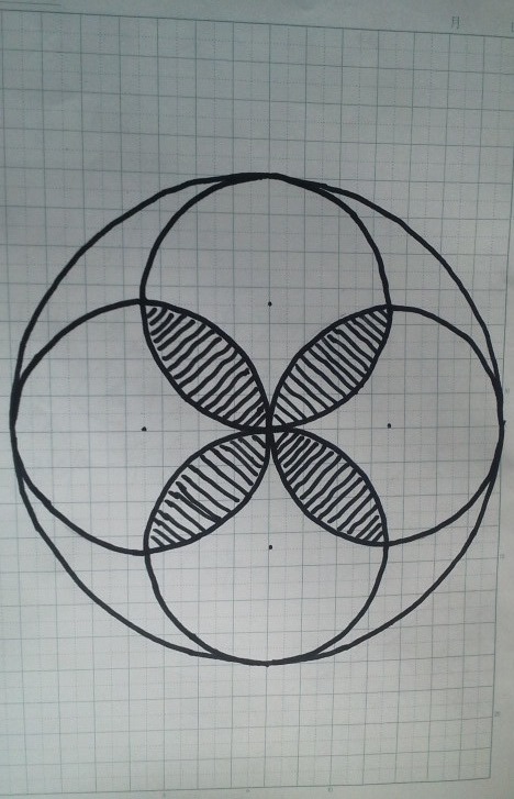 コンパスで大円1つと小円4つを書いてから、サインペン(フリーハンド)でなぞりました。