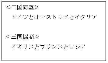 産業革命以後、いろいろな商品が大量生産されるようになり、売り場を求めて各国が植民地を広げていきました。そんなヨーロッパの中で、ドイツはオーストリアやイタリアと三国同盟を結んで、イギリスやフランスが植民地を大きく広げることを警戒しました。すると、イギリスもフランスとロシアと三国協商を結んで、ドイツと対立しはじめました。