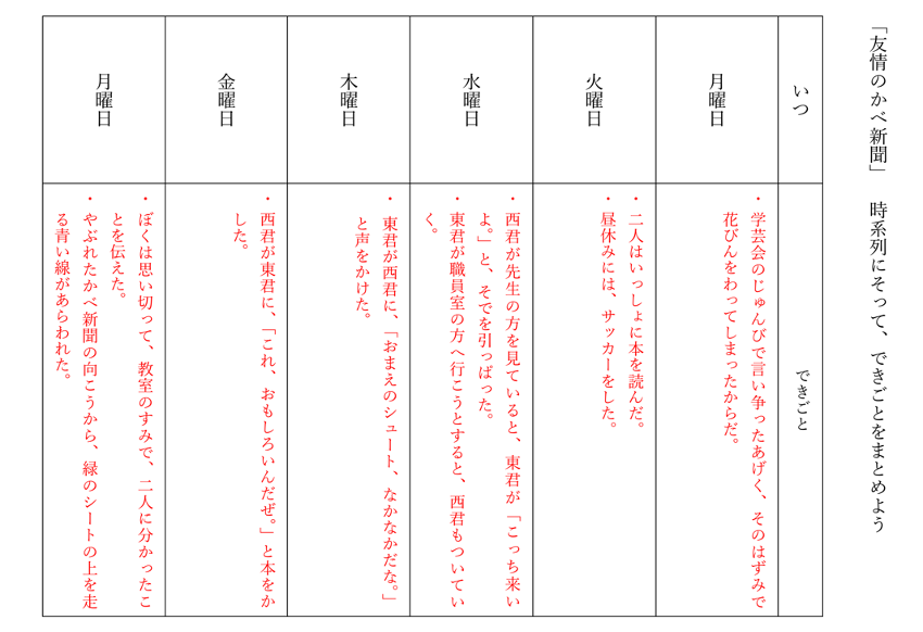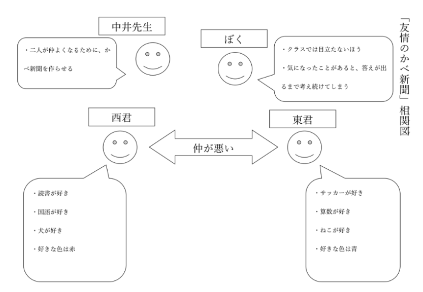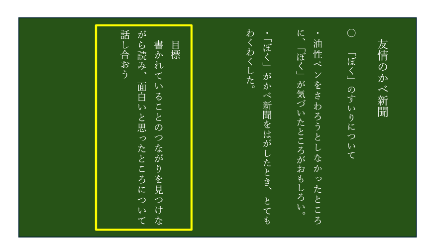 教師:「次回は、『友情のかべ新聞』の内容を確かめながら読みましょう。」