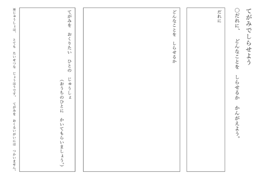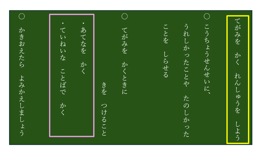 教師:「嬉しかったことや楽しかったことを、手紙に書いて知らせましょう。」