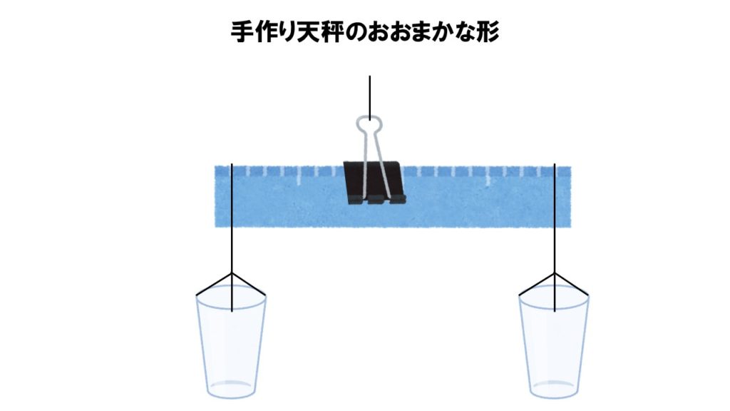 30cm定規の真ん中をクリップで止め、紐でつるす。その後、定規の両端にプラスチックのコップをそれぞれ紐でくくりつけたら完成。片側に重さを量りたいもの、反対側には任意単位を入れて重さを量ることができる。天秤では直接比較もできるが、どれだけの違いがあるのかを調べるためには任意単位による比較が有用であることを意識させる。