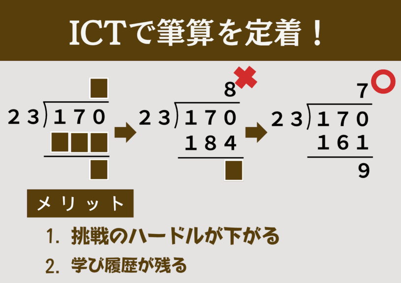 児童が積極的に手を動かせるようにするため、ICT上での検算を許可することをお勧めする。もちろん、電卓機能等は禁止して、手書き機能のみ活用することをルールとして提示する必要がある。