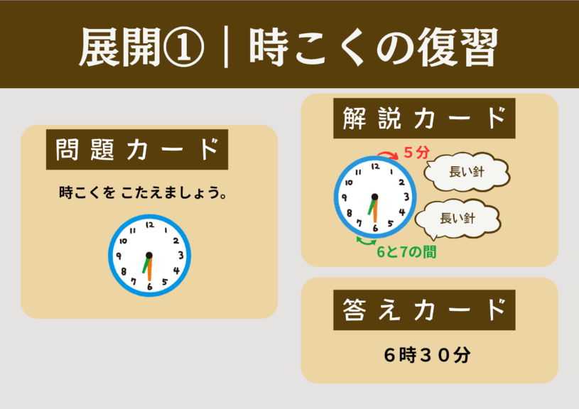 小学1年生で学んだ「なんじ なんじはん」「なんじなんぷん」の復習で、半=30分であったことや5分ごとの目盛についての振り返りができる演習とする。