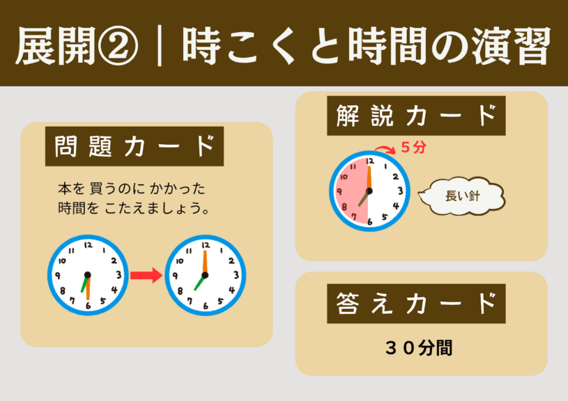 展開②|めくりドリルで簡単な場合の「時こく」や「時間」を求める