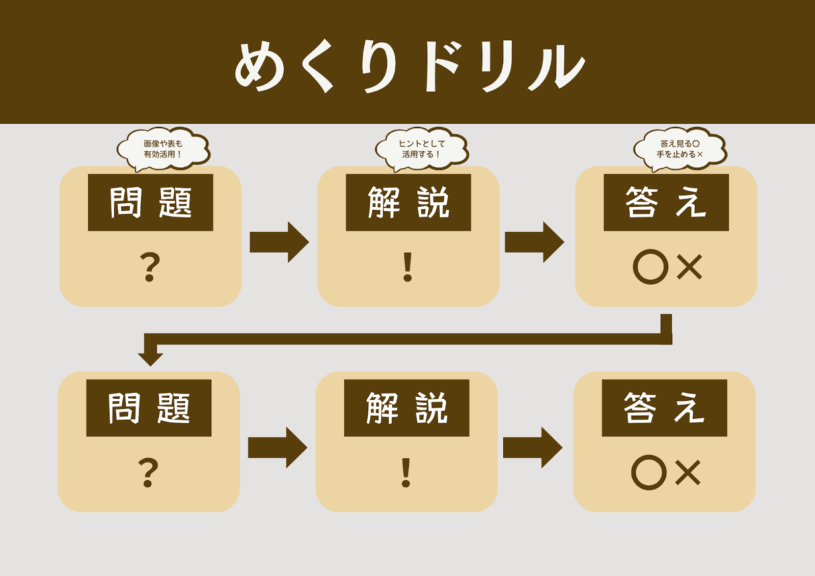 めくりドリルとは、問題カード(⇒解説カード)⇒答えカード⇒問題カード⇒……(以下、繰り返し)となるように並べたICT上の計算ドリルのことである。