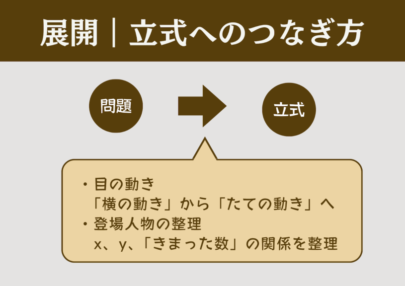 →式にxとyが入ることを意識づけることに加え、目の動きを「横の動き」から「たての動き」に変えさせる。 - 「この問題の登場人物は、xとy以外に誰がいるでしょうか?」