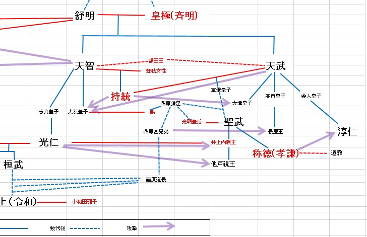 はじめに 複雑な人間関係(蘇我氏・天智を中心に).xls ↑まず、このファイルをご覧ください。天平~奈良時代の天皇を中心とした人間関係は、実に複雑であることがわかります。下の図は、エクセルファイルで作った関係図の一部です。 下記リンク先も是非ご...